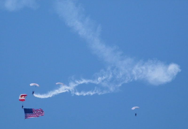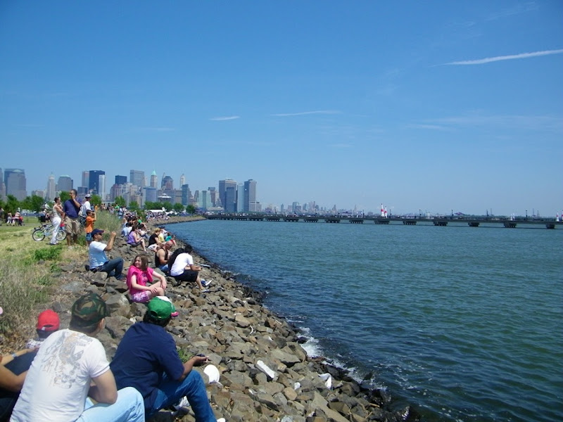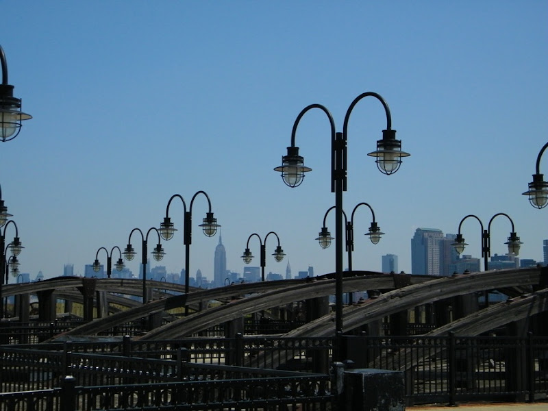 自Liberty State Park沿河騎到了渡輪口, 這兒有渡輪到自由女神像的小島及到紐約的水上計程車, 還有座廢棄的火車站, 港口邊古老的路燈群, 仍然忠實的守護著火車軌道遺跡, 遙望那高聳但如拇指大小的帝國大廈, 夾在燈群中很有意思。 逛著逛著, 比賽的時間已到, 跳傘隊揭開了序幕。